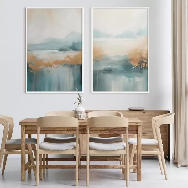 Poster Abstrakte Landschaft mit Bergen und See in Blaugrün und strukturiertem Gelb, weiche Pinselstriche, minimalistisches Kunstwerk d01012