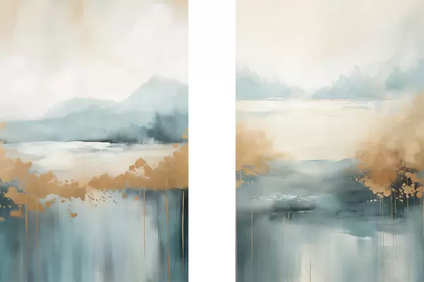 Poster Abstrakte Landschaft mit Bergen und See in Blaugrün und strukturiertem Gelb, weiche Pinselstriche, minimalistisches Kunstwerk d01012