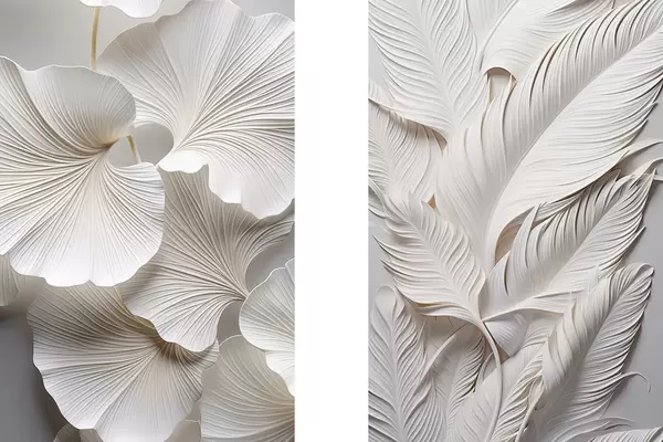 Poster Weiße Ginkgoblätter und lange Blätter mit filigranen Details, die einen strukturierten und vielschichtigen Effekt erzeugen, minimalistische Kunst d01013