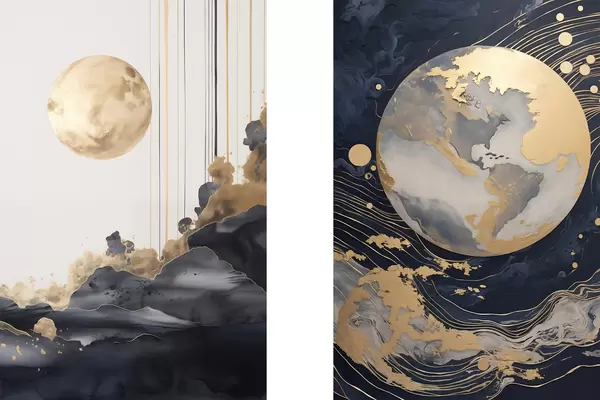 Poster Strukturierter dekorativer Planet im Weltraum mit gelben Linien und Punkten, abstrakter Stil, minimalistisch und modern Nr d01014