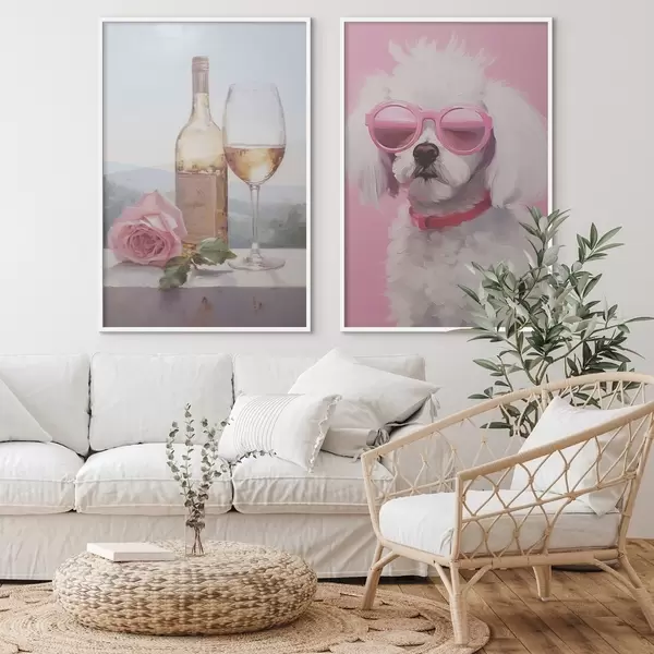 Poster Eine Flasche und ein Glas Wein und ein Pudel mit Brille, Gemäldeimitation d01021