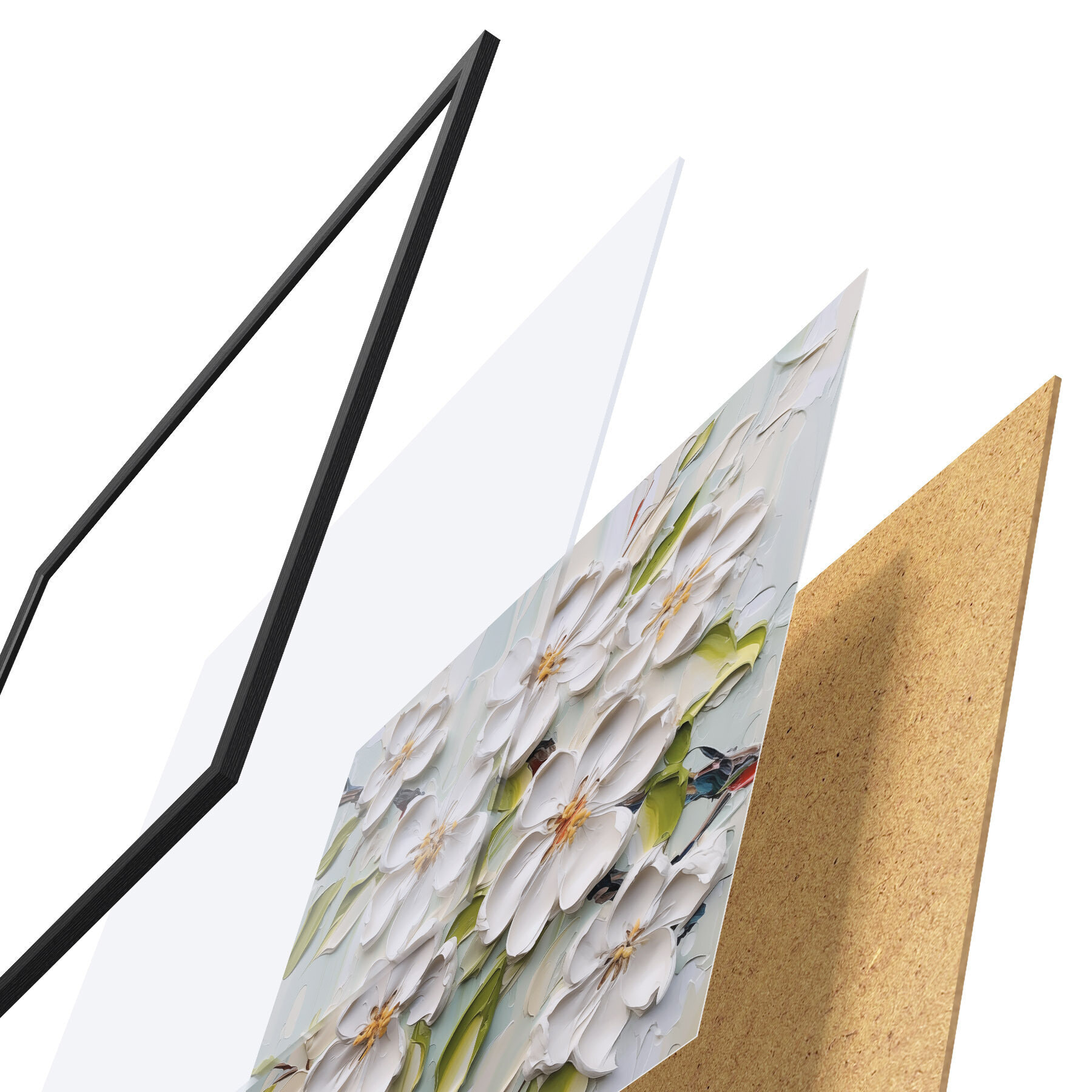 Das Poster besteht aus einem Rahmen, Plexiglas, einem gedruckten Bild und einer Rückwand aus Spanplatten. Dank der Halterungen auf der Rückseite kann das Poster sofort an die Wand gehängt werden.