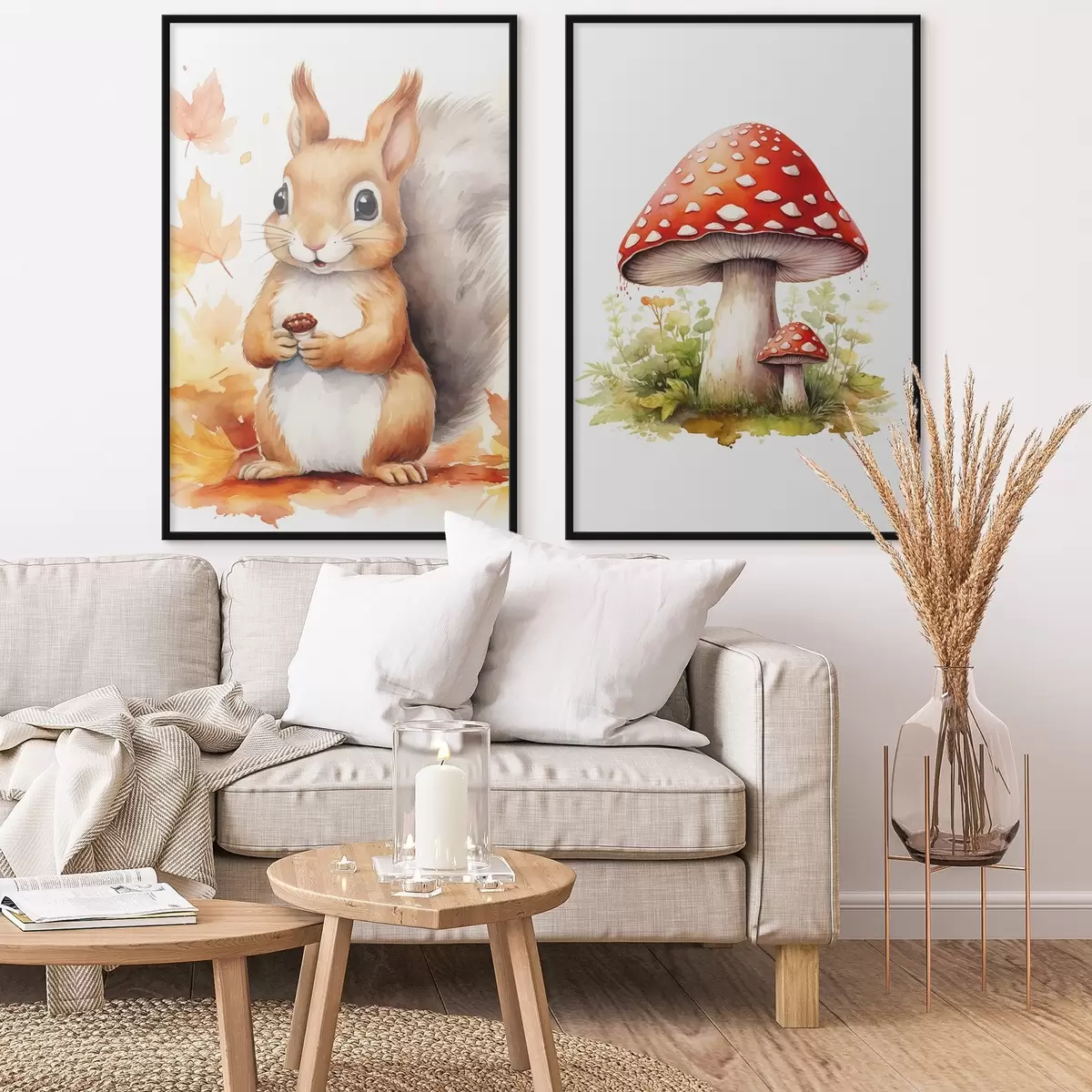 Poster Eichhörnchen und Waldpilz, Fliegenpilz, Aquarellimitation Nr d01049