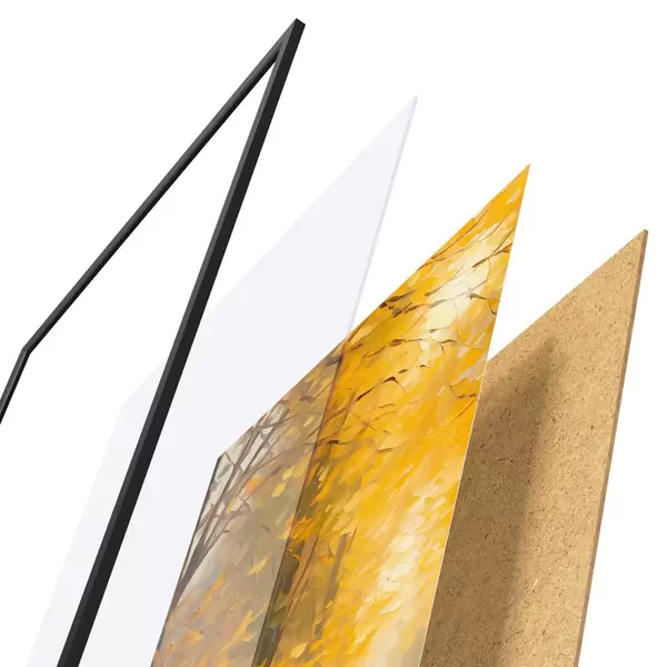 Das Poster besteht aus einem Rahmen, Plexiglas, einem gedruckten Bild und einer Rückwand aus Spanplatten. Dank der Halterungen auf der Rückseite kann das Poster sofort an die Wand gehängt werden.