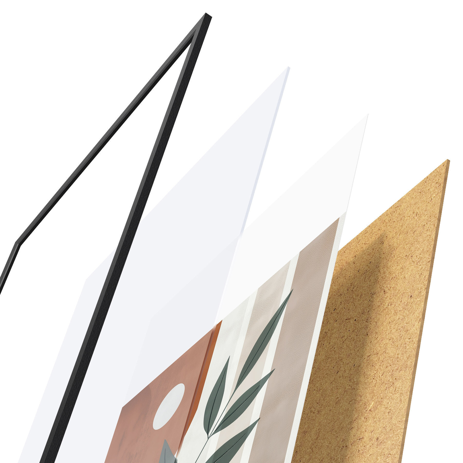 Das Poster besteht aus einem Rahmen, Plexiglas, einem gedruckten Bild und einer Rückwand aus Spanplatten. Dank der Halterungen auf der Rückseite kann das Poster sofort an die Wand gehängt werden.