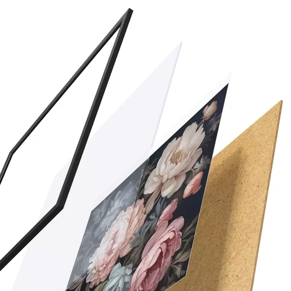Das Poster besteht aus einem Rahmen, Plexiglas, einem gedruckten Bild und einer Rückwand aus Spanplatten. Dank der Halterungen auf der Rückseite kann das Poster sofort an die Wand gehängt werden.
