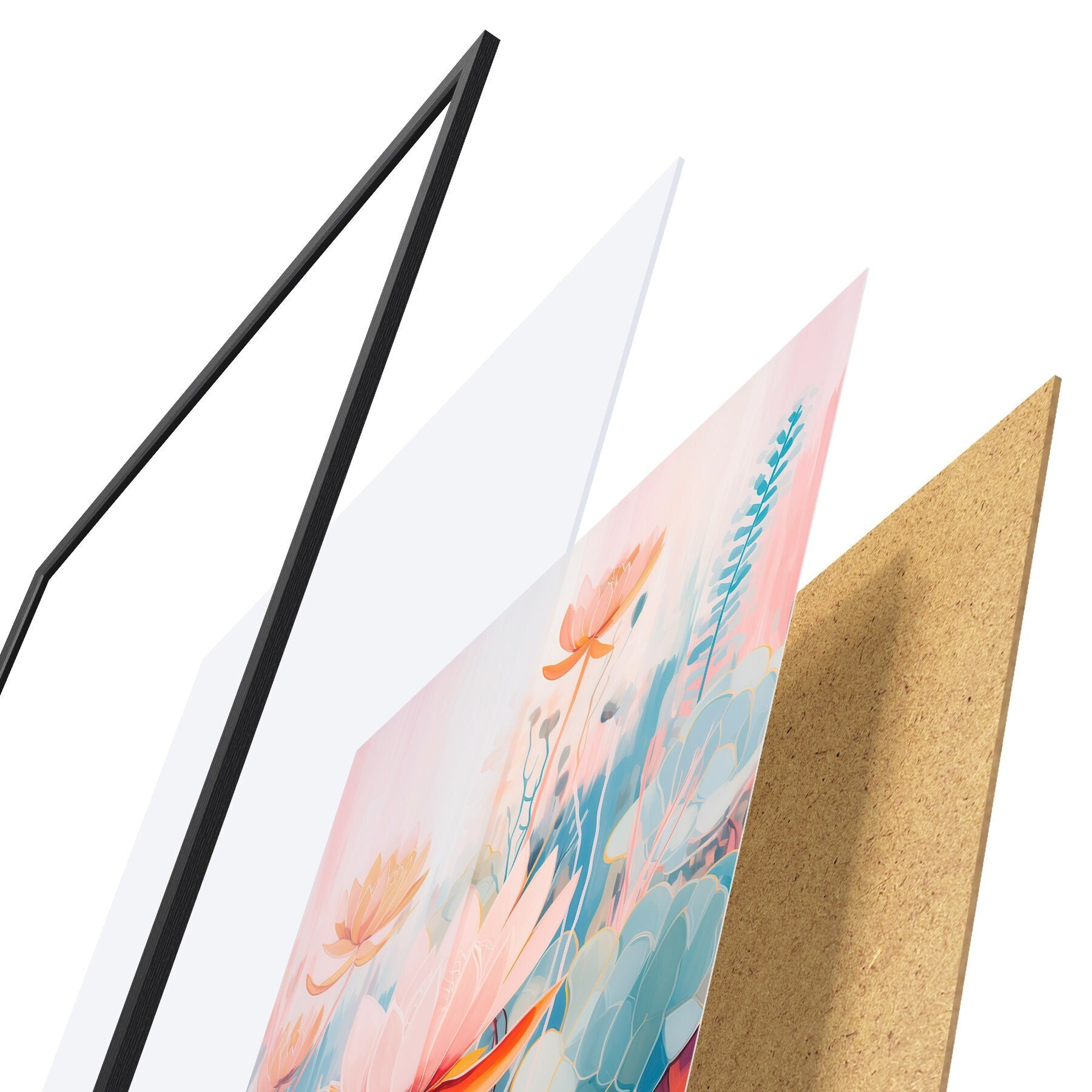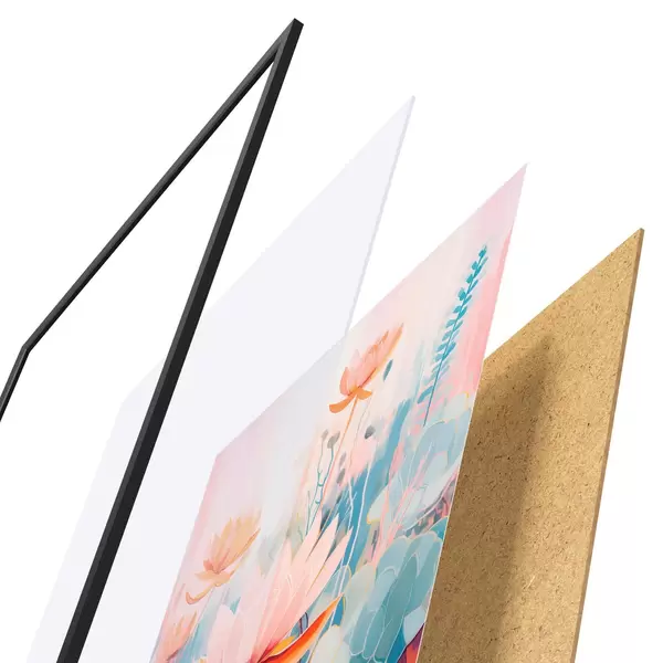 Das Poster besteht aus einem Rahmen, Plexiglas, einem gedruckten Bild und einer Rückwand aus Spanplatten. Dank der Halterungen auf der Rückseite kann das Poster sofort an die Wand gehängt werden.