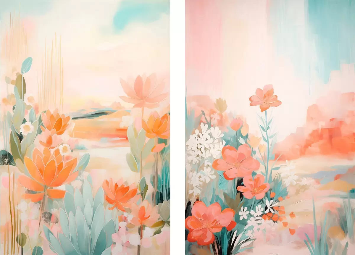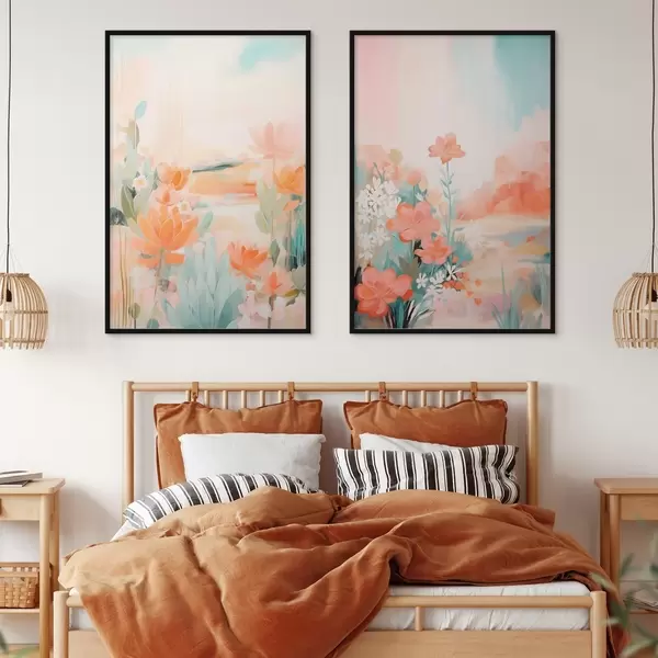 Poster Blumenmotive in Pastelltönen vor dem Hintergrund eines leicht nebligen Tals Nr d01085