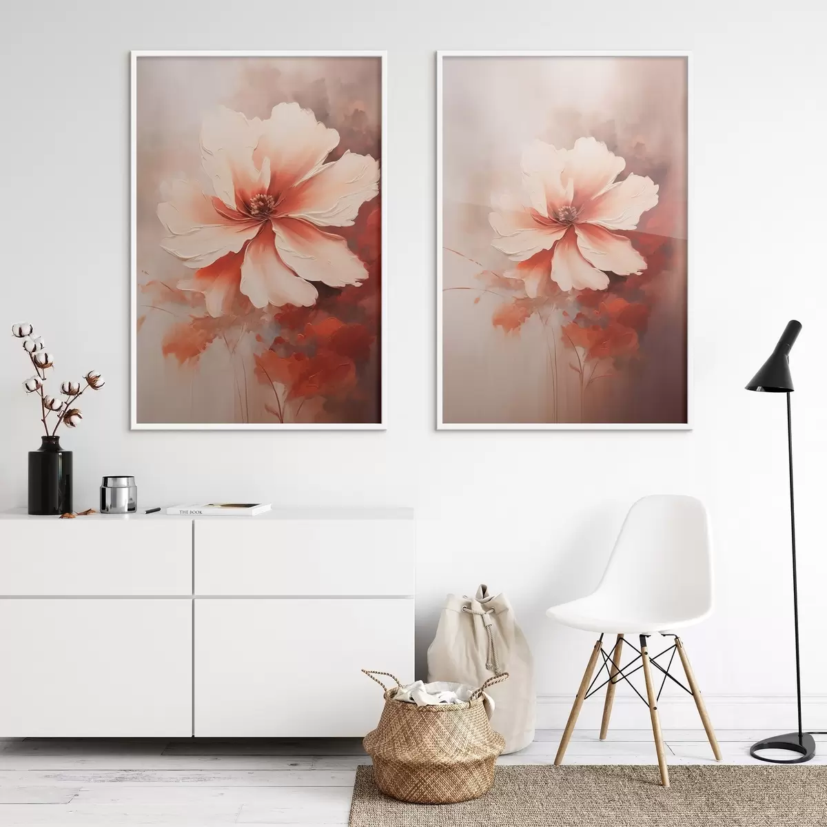 Poster Blumenkomposition: weiße und cremefarbene Blütenblätter, korallenrote Akzente und ein sanfter, nebliger Hintergrund d01088