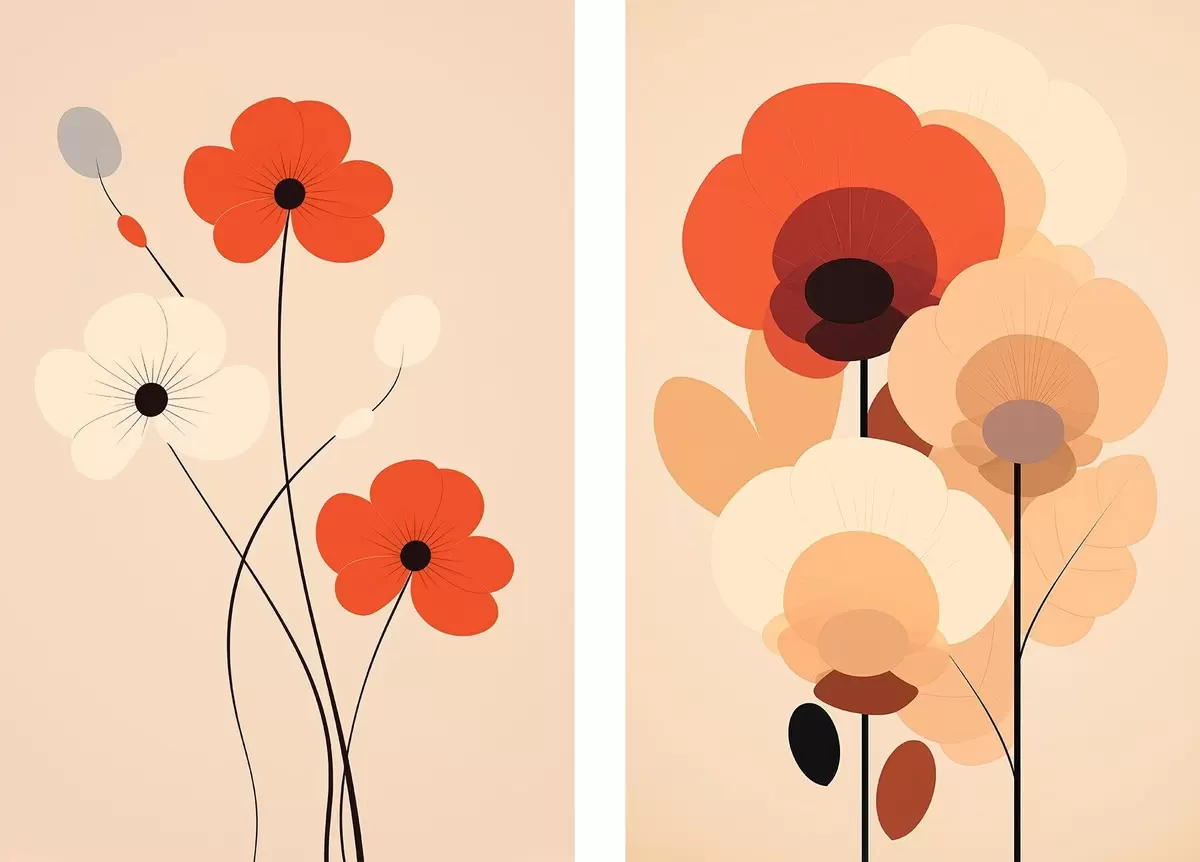 Poster Minimalistisches Blumendiptychon in warmen Beige-Korallentönen mit grafischen Linien d01090