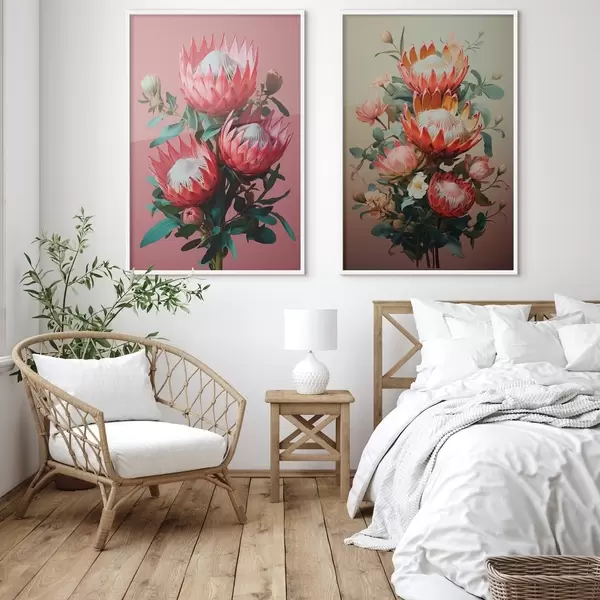 Poster Proteas in zwei Stimmungen: satter rosa Hintergrund und warmer Olivgrün-Farbverlauf Nr d01092
