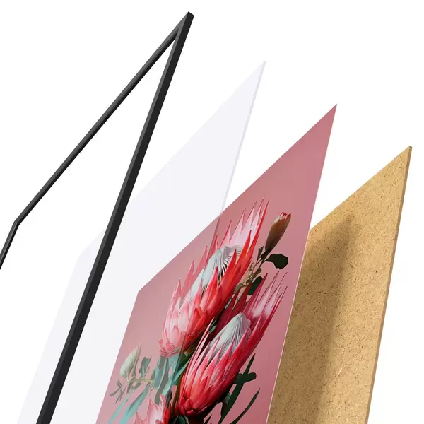 Das Poster besteht aus einem Rahmen, Plexiglas, einem gedruckten Bild und einer Rückwand aus Spanplatten. Dank der Halterungen auf der Rückseite kann das Poster sofort an die Wand gehängt werden.