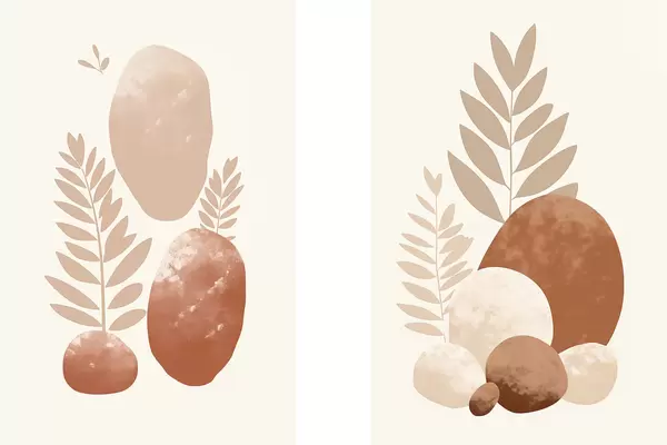 Poster Abstrakte Formen, strukturierte Steine und Blätter in gedeckten Pfirsich- und Terrakottatönen, minimalistisch, cremefarbener Hintergrund Nr d01114