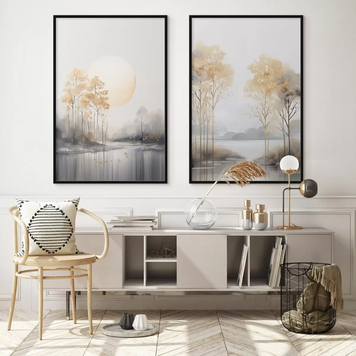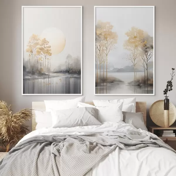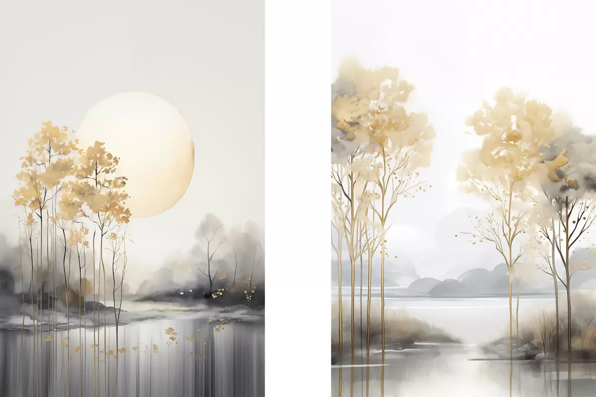 Poster Dekorative abstrakte Landschaft, hohe Bäume mit gelben Blättern, ein Fluss und Nebel im Hintergrund Nr d01115