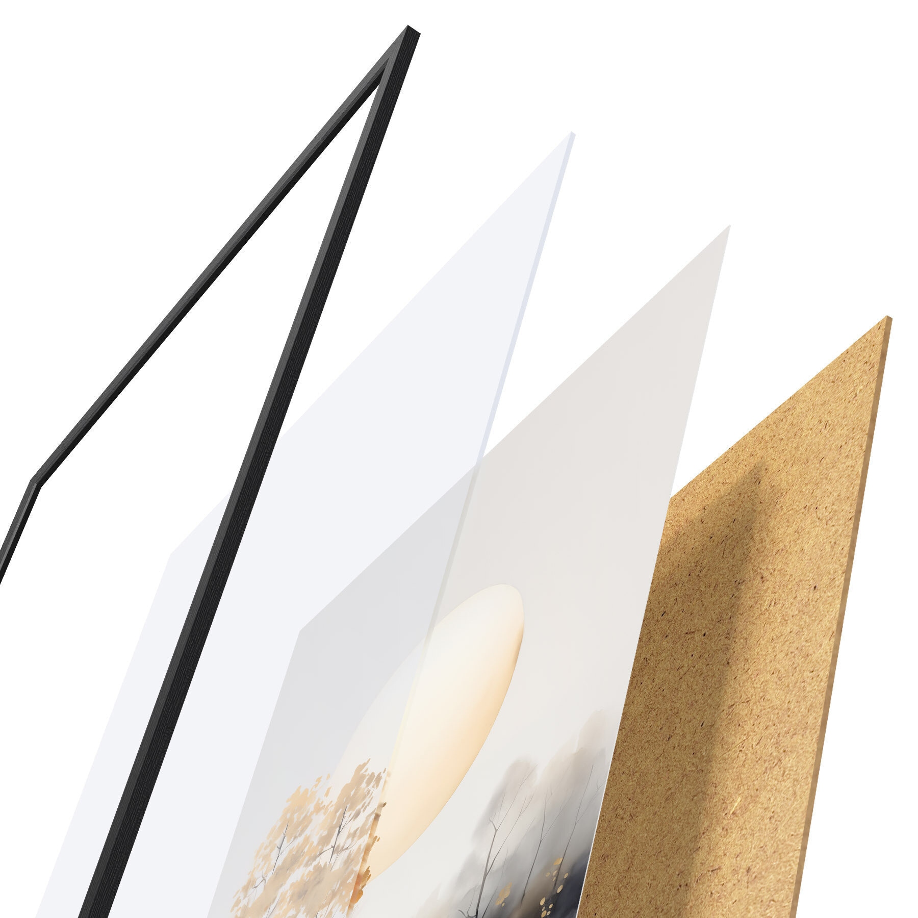 Das Poster besteht aus einem Rahmen, Plexiglas, einem gedruckten Bild und einer Rückwand aus Spanplatten. Dank der Halterungen auf der Rückseite kann das Poster sofort an die Wand gehängt werden.