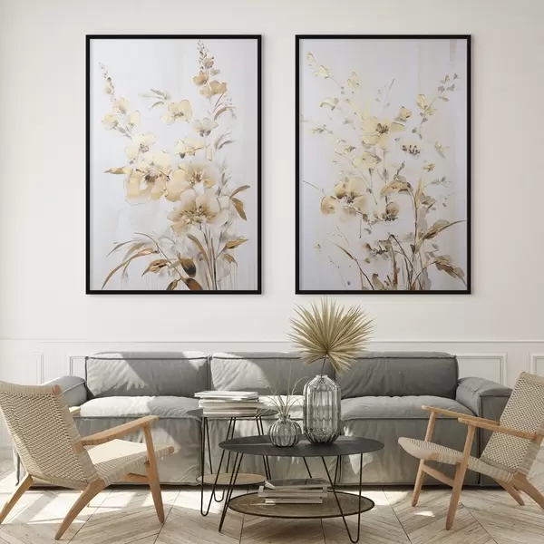 Poster Strukturierte gelbe Blüten und Blätter vor weißem Hintergrund, mit zarten Pinselstrichen Nr d01116