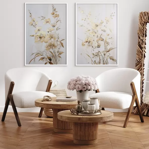 Poster Strukturierte gelbe Blüten und Blätter vor weißem Hintergrund, mit zarten Pinselstrichen d01116