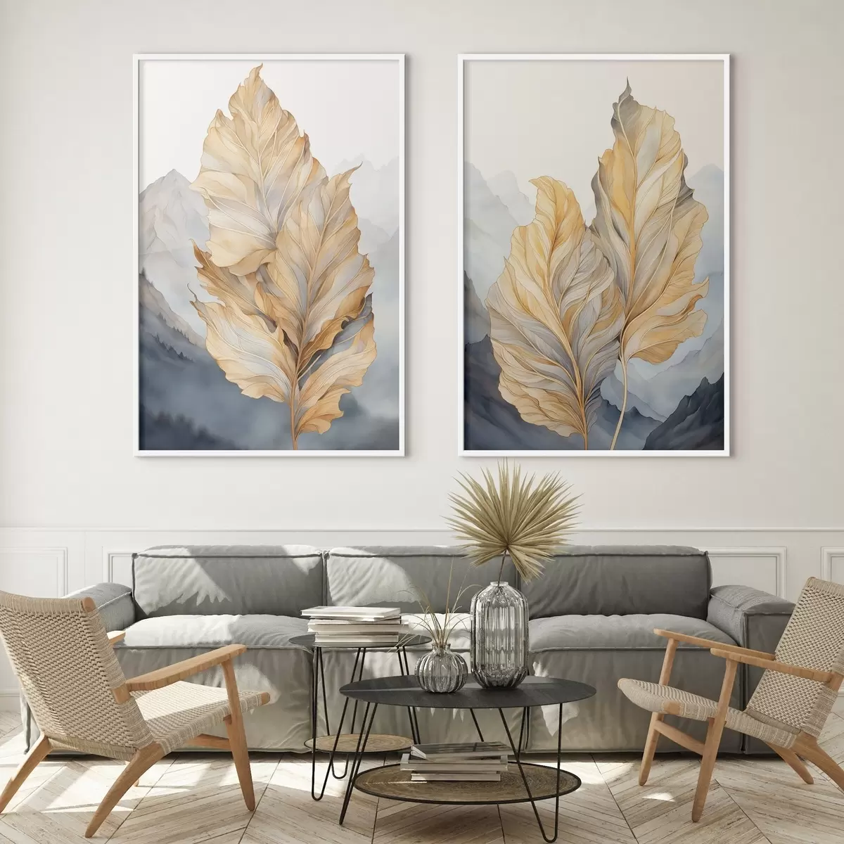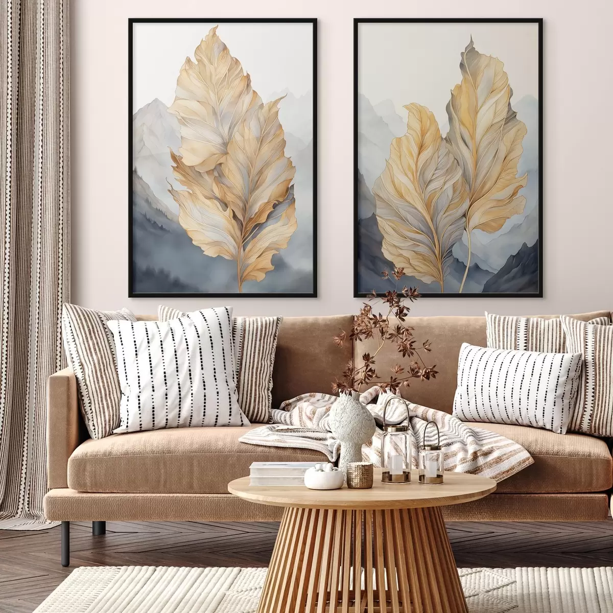 Poster Abstrakte große, gelbe und braune Blätter mit komplexen Details vor einer Berglandschaft Nr d01119