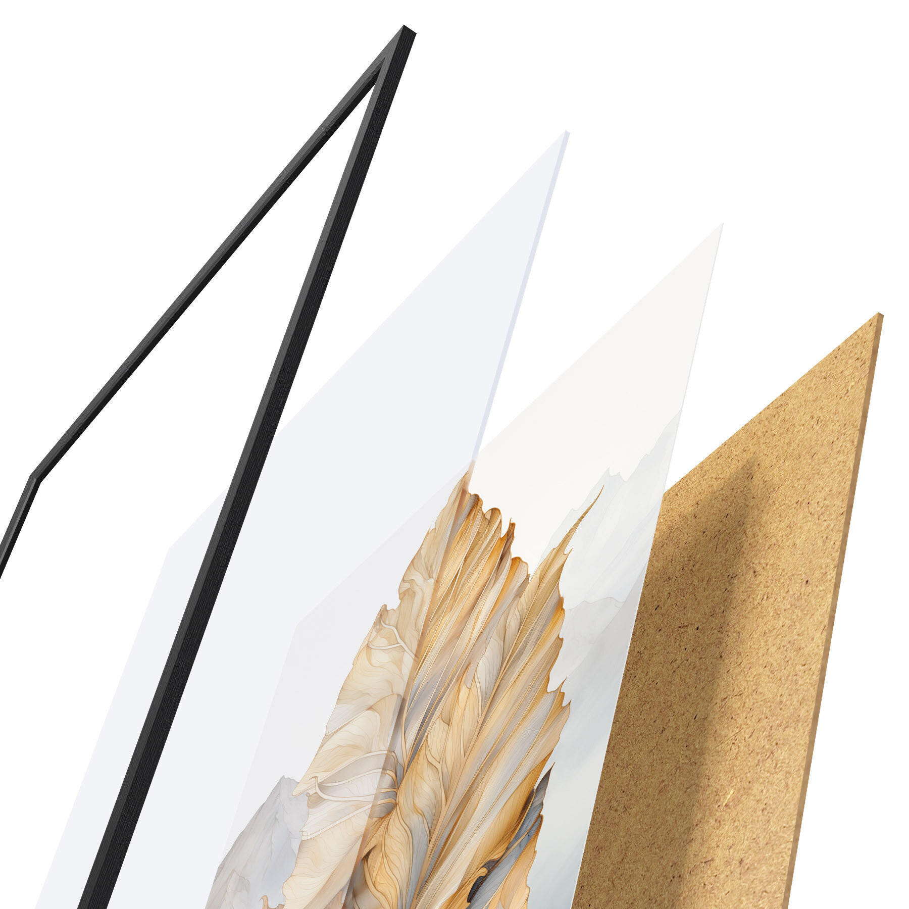 Das Poster besteht aus einem Rahmen, Plexiglas, einem gedruckten Bild und einer Rückwand aus Spanplatten. Dank der Halterungen auf der Rückseite kann das Poster sofort an die Wand gehängt werden.