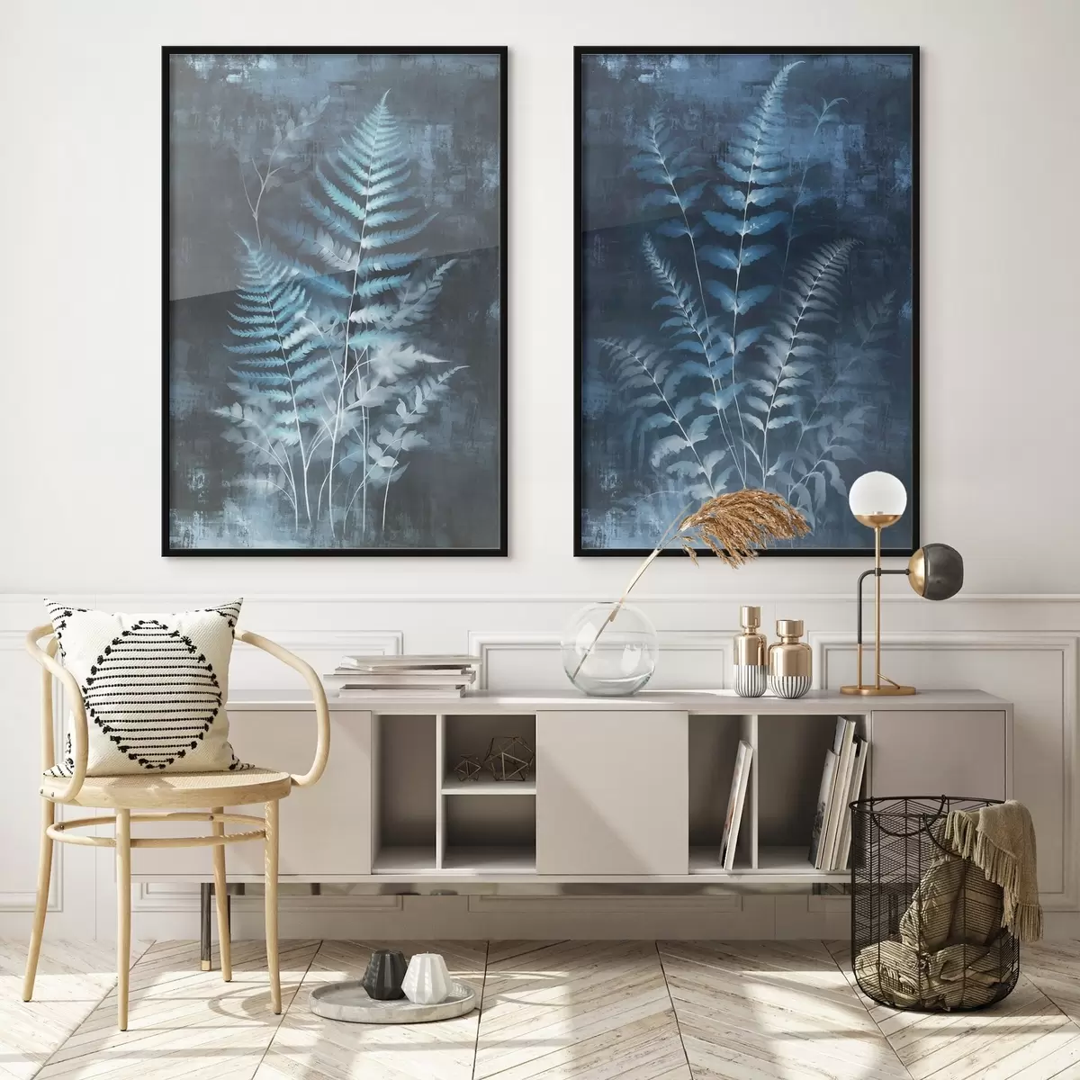 Poster Blaue Farne und Pflanzen vor einem dunklen, strukturierten Hintergrund, mit Fokus auf den komplexen Details, Röntgeneffekt d01121