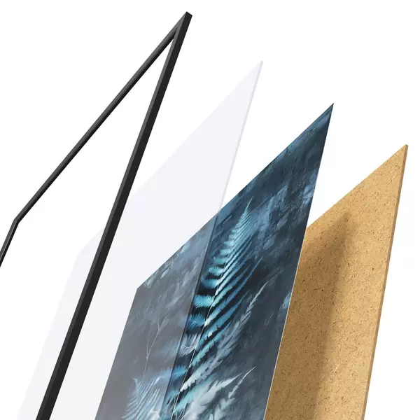 Das Poster besteht aus einem Rahmen, Plexiglas, einem gedruckten Bild und einer Rückwand aus Spanplatten. Dank der Halterungen auf der Rückseite kann das Poster sofort an die Wand gehängt werden.