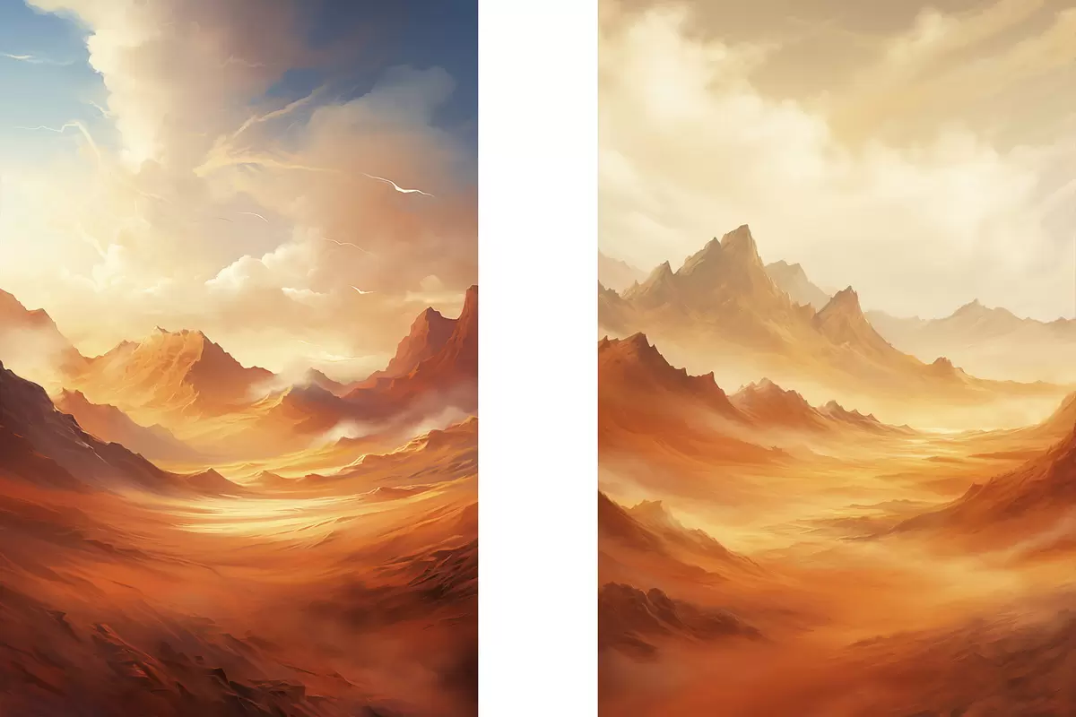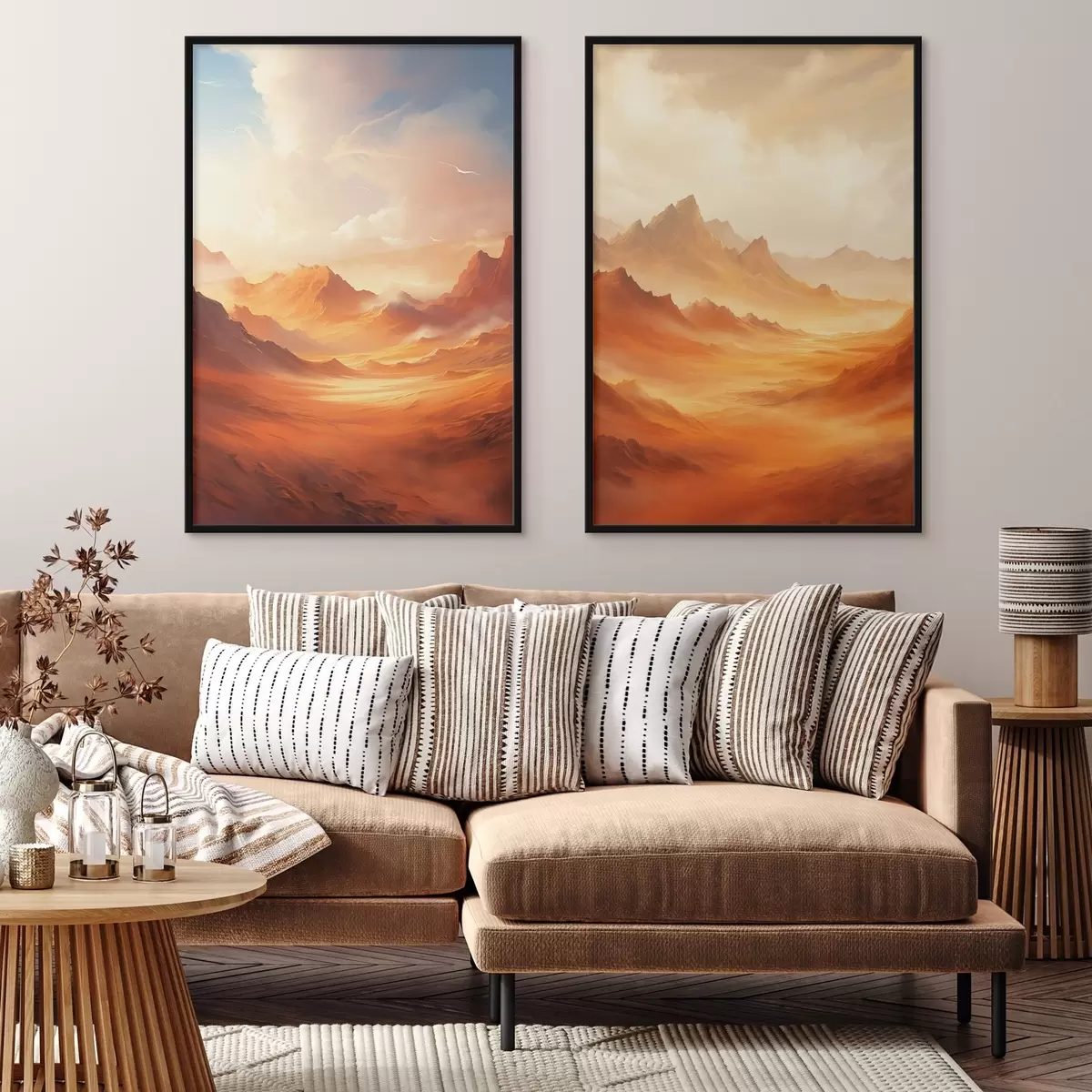 Poster Eine weite, orangefarbene Wüstenlandschaft mit hoch aufragenden, felsigen Bergen unter einem dunstigen, sonnenbeschienenen Himmel mit dünnen Wolken. Nr d01122