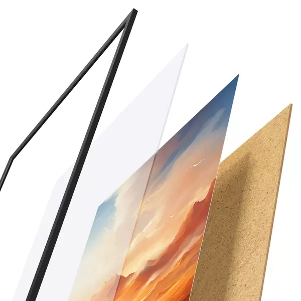Das Poster besteht aus einem Rahmen, Plexiglas, einem gedruckten Bild und einer Rückwand aus Spanplatten. Dank der Halterungen auf der Rückseite kann das Poster sofort an die Wand gehängt werden.
