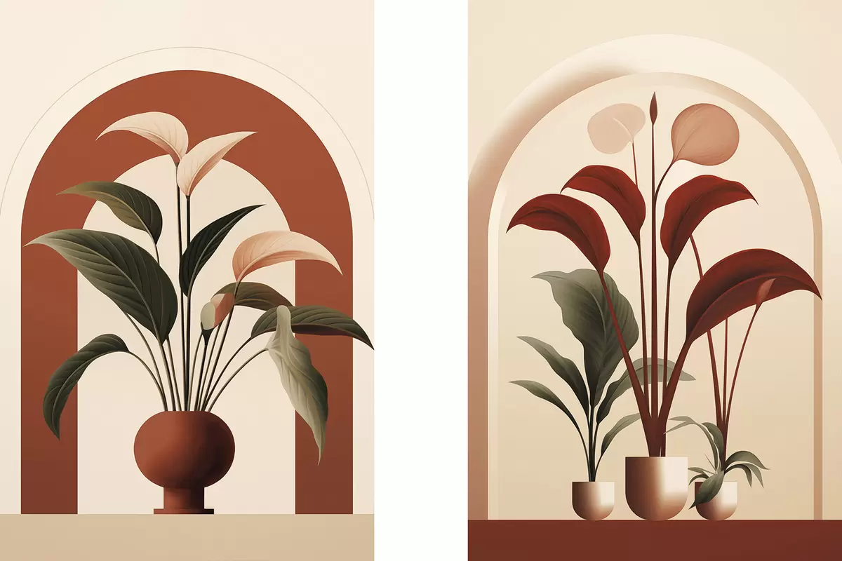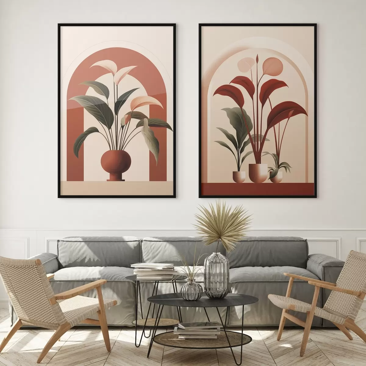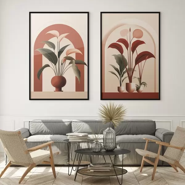 Poster Abstrakte Topfpflanzen mit großen grünen und roten Blättern vor einem cremefarbenen Torbogen Nr d01124