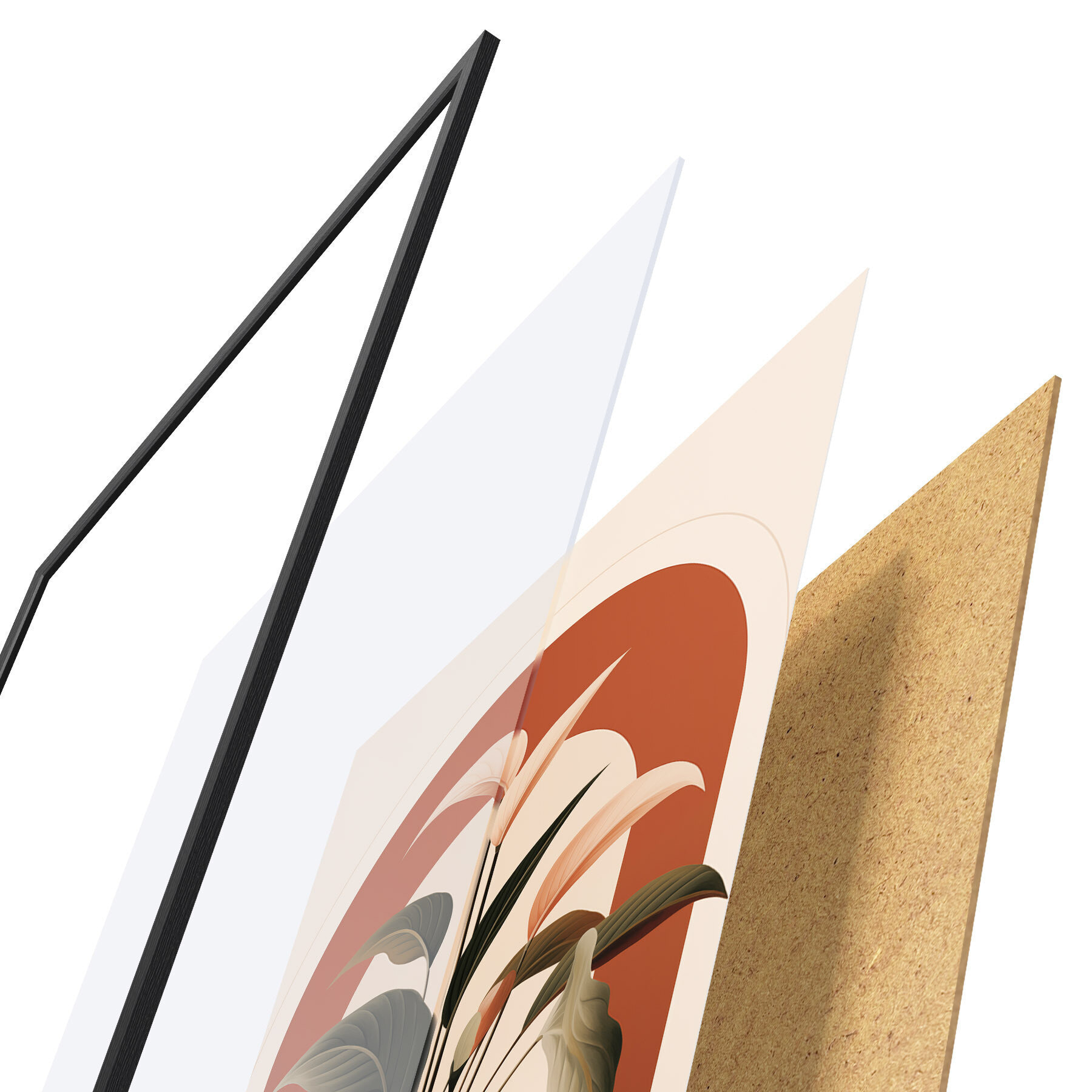 Das Poster besteht aus einem Rahmen, Plexiglas, einem gedruckten Bild und einer Rückwand aus Spanplatten. Dank der Halterungen auf der Rückseite kann das Poster sofort an die Wand gehängt werden.