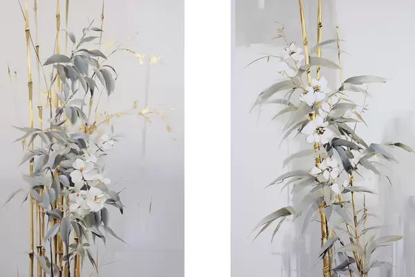 Poster Abstrakte Bambusstämme mit gelben Akzenten, zarten weißen Blüten und hellgrünen Blättern, grauer Hintergrund Nr d01127