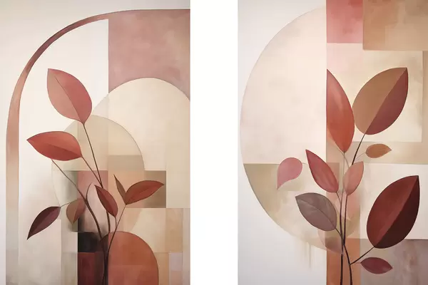 Poster Abstrakte Pflanze mit roten Blättern vor einem Hintergrund aus geometrischen Formen und sanften, gedämpften Farben Nr d01128
