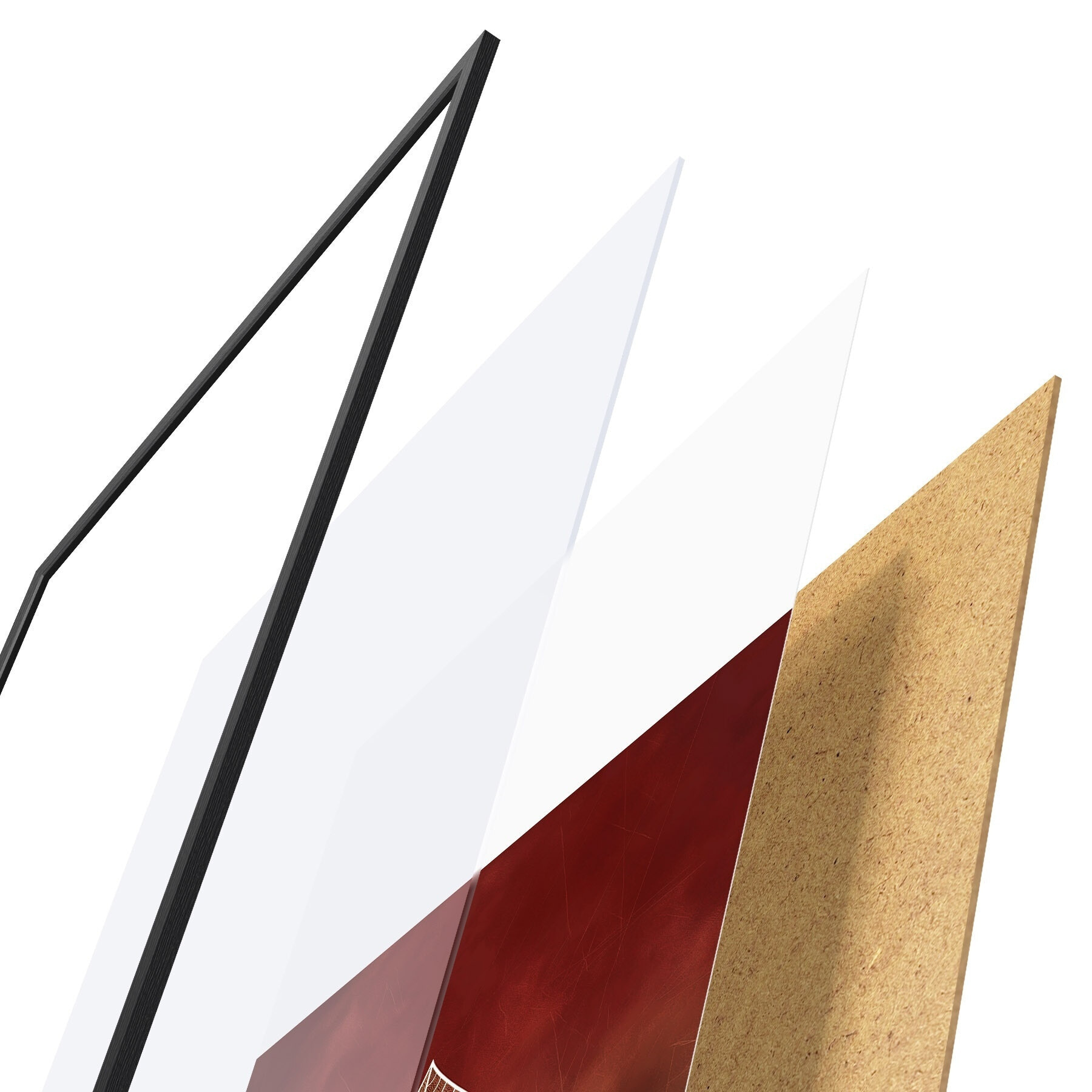 Das Poster besteht aus einem Rahmen, Plexiglas, einem gedruckten Bild und einer Rückwand aus Spanplatten. Dank der Halterungen auf der Rückseite kann das Poster sofort an die Wand gehängt werden.