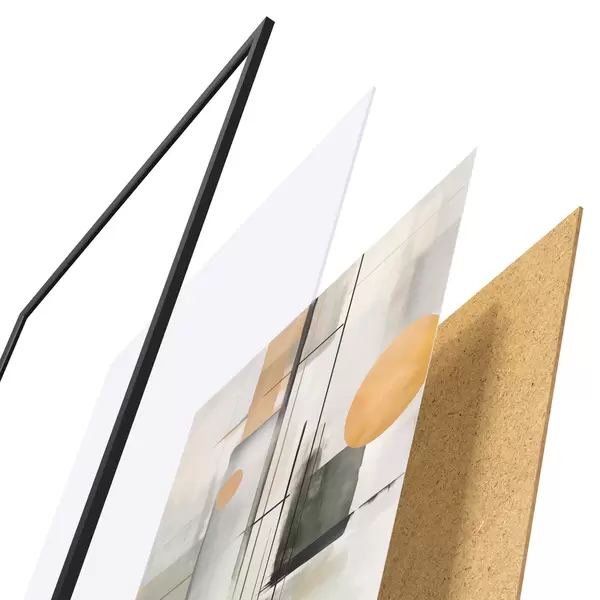 Das Poster besteht aus einem Rahmen, Plexiglas, einem gedruckten Bild und einer Rückwand aus Spanplatten. Dank der Halterungen auf der Rückseite kann das Poster sofort an die Wand gehängt werden.