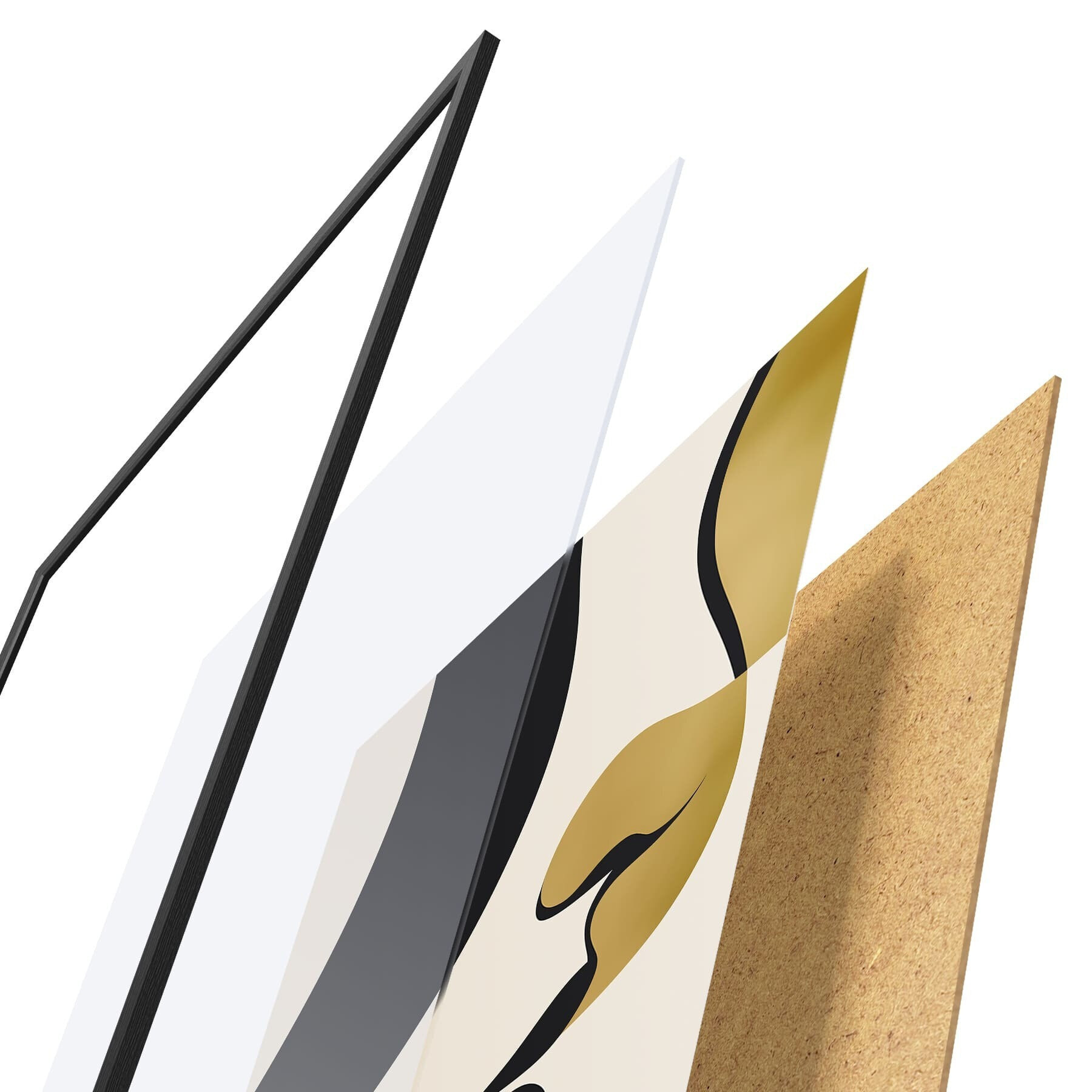 Das Poster besteht aus einem Rahmen, Plexiglas, einem gedruckten Bild und einer Rückwand aus Spanplatten. Dank der Halterungen auf der Rückseite kann das Poster sofort an die Wand gehängt werden.