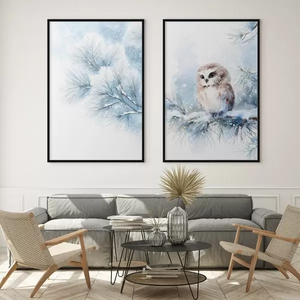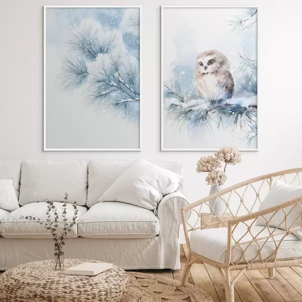 Poster Niedliche Eule auf einem schneebedeckten Tannenzweig im Aquarellstil d01168