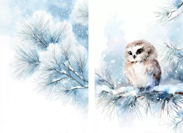Poster Niedliche Eule auf einem schneebedeckten Tannenzweig im Aquarellstil d01168