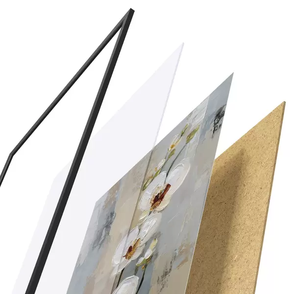 Das Poster besteht aus einem Rahmen, Plexiglas, einem gedruckten Bild und einer Rückwand aus Spanplatten. Dank der Halterungen auf der Rückseite kann das Poster sofort an die Wand gehängt werden.