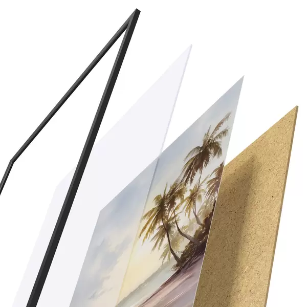 Das Poster besteht aus einem Rahmen, Plexiglas, einem gedruckten Bild und einer Rückwand aus Spanplatten. Dank der Halterungen auf der Rückseite kann das Poster sofort an die Wand gehängt werden.
