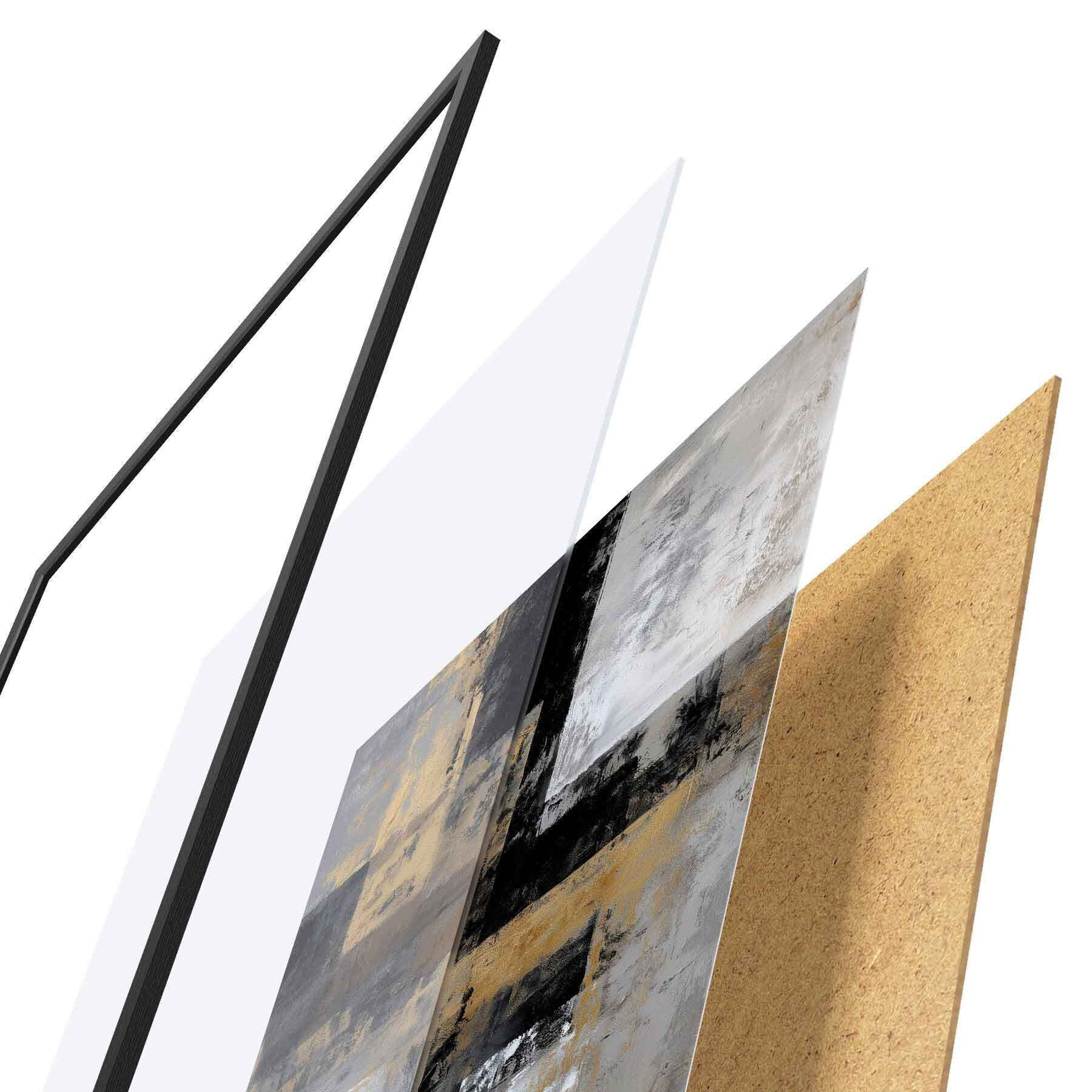 Das Poster besteht aus einem Rahmen, Plexiglas, einem gedruckten Bild und einer Rückwand aus Spanplatten. Dank der Halterungen auf der Rückseite kann das Poster sofort an die Wand gehängt werden.