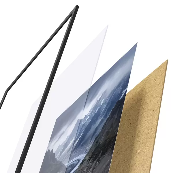 Das Poster besteht aus einem Rahmen, Plexiglas, einem gedruckten Bild und einer Rückwand aus Spanplatten. Dank der Halterungen auf der Rückseite kann das Poster sofort an die Wand gehängt werden.