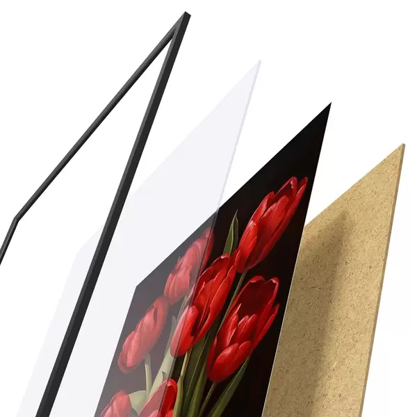 Das Poster besteht aus einem Rahmen, Plexiglas, einem gedruckten Bild und einer Rückwand aus Spanplatten. Dank der Halterungen auf der Rückseite kann das Poster sofort an die Wand gehängt werden.