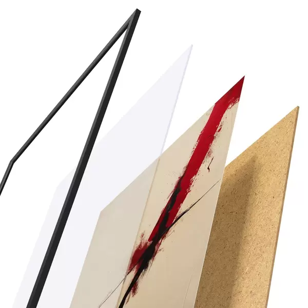 Das Poster besteht aus einem Rahmen, Plexiglas, einem gedruckten Bild und einer Rückwand aus Spanplatten. Dank der Halterungen auf der Rückseite kann das Poster sofort an die Wand gehängt werden.