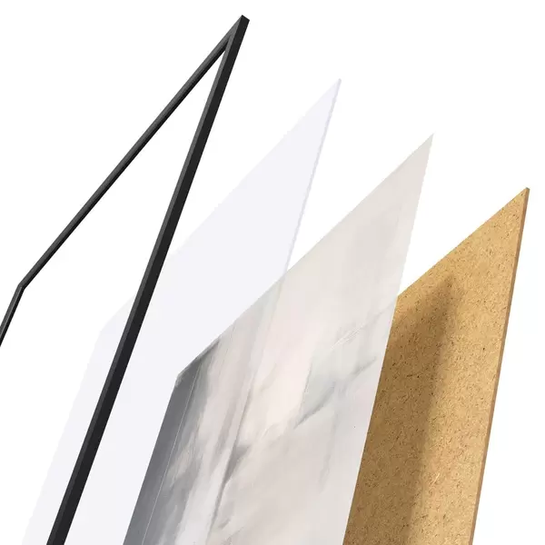 Das Poster besteht aus einem Rahmen, Plexiglas, einem gedruckten Bild und einer Rückwand aus Spanplatten. Dank der Halterungen auf der Rückseite kann das Poster sofort an die Wand gehängt werden.