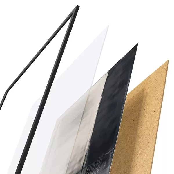 Das Poster besteht aus einem Rahmen, Plexiglas, einem gedruckten Bild und einer Rückwand aus Spanplatten. Dank der Halterungen auf der Rückseite kann das Poster sofort an die Wand gehängt werden.