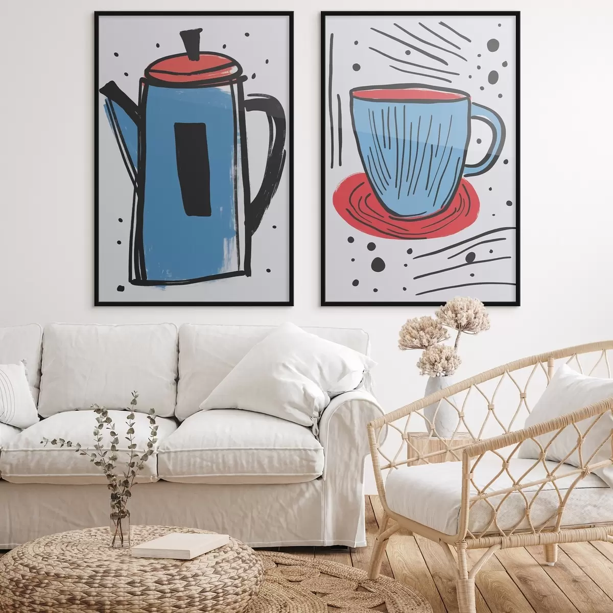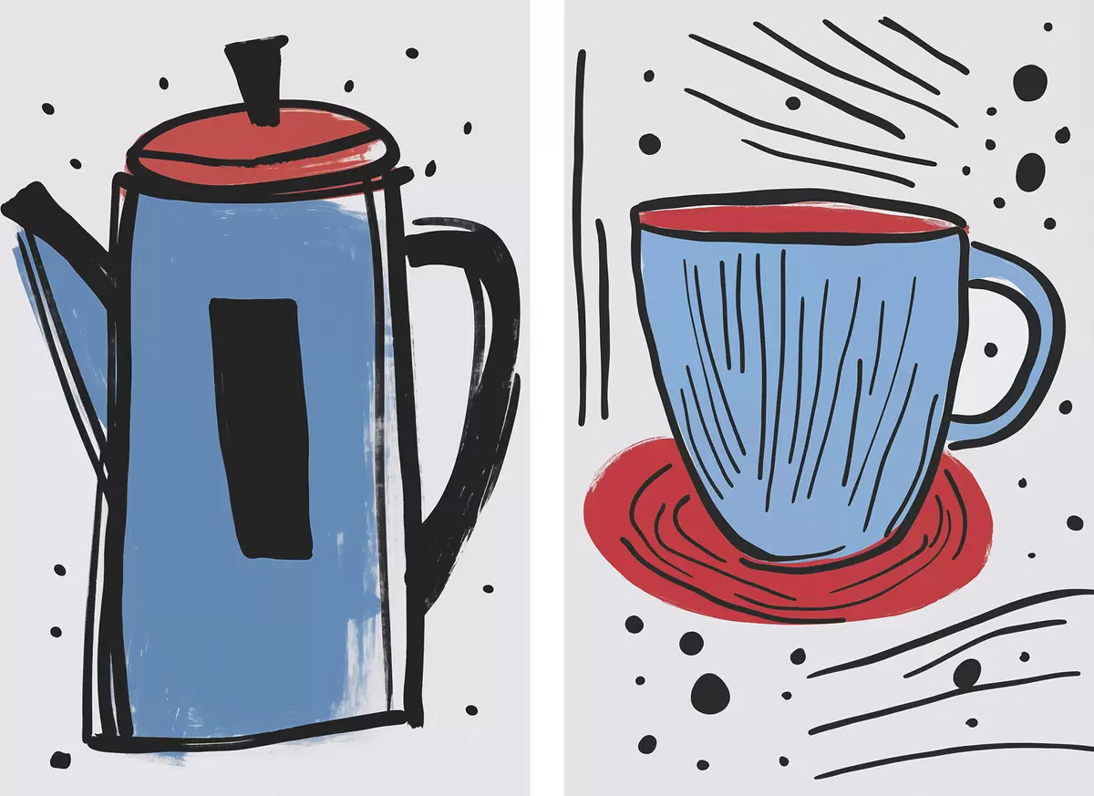 Poster Kaffeekanne und Tasse, Nachahmung einer primitiven Zeichnung d01225