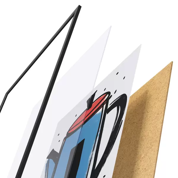 Das Poster besteht aus einem Rahmen, Plexiglas, einem gedruckten Bild und einer Rückwand aus Spanplatten. Dank der Halterungen auf der Rückseite kann das Poster sofort an die Wand gehängt werden.