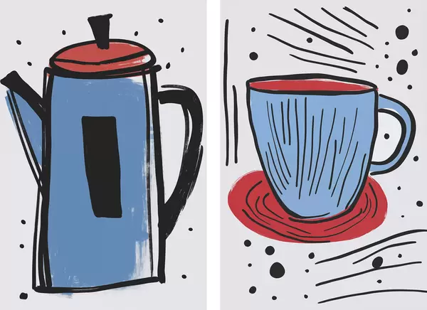 Poster Kaffeekanne und Tasse, Nachahmung einer primitiven Zeichnung d01225