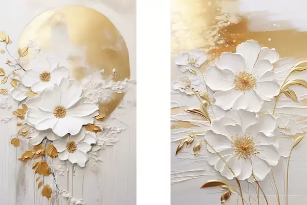 Poster Weiße Blumen mit gelben Akzenten und zarten Blättern vor einem strukturierten Hintergrund, moderne Kunst d01233