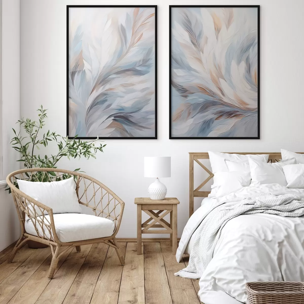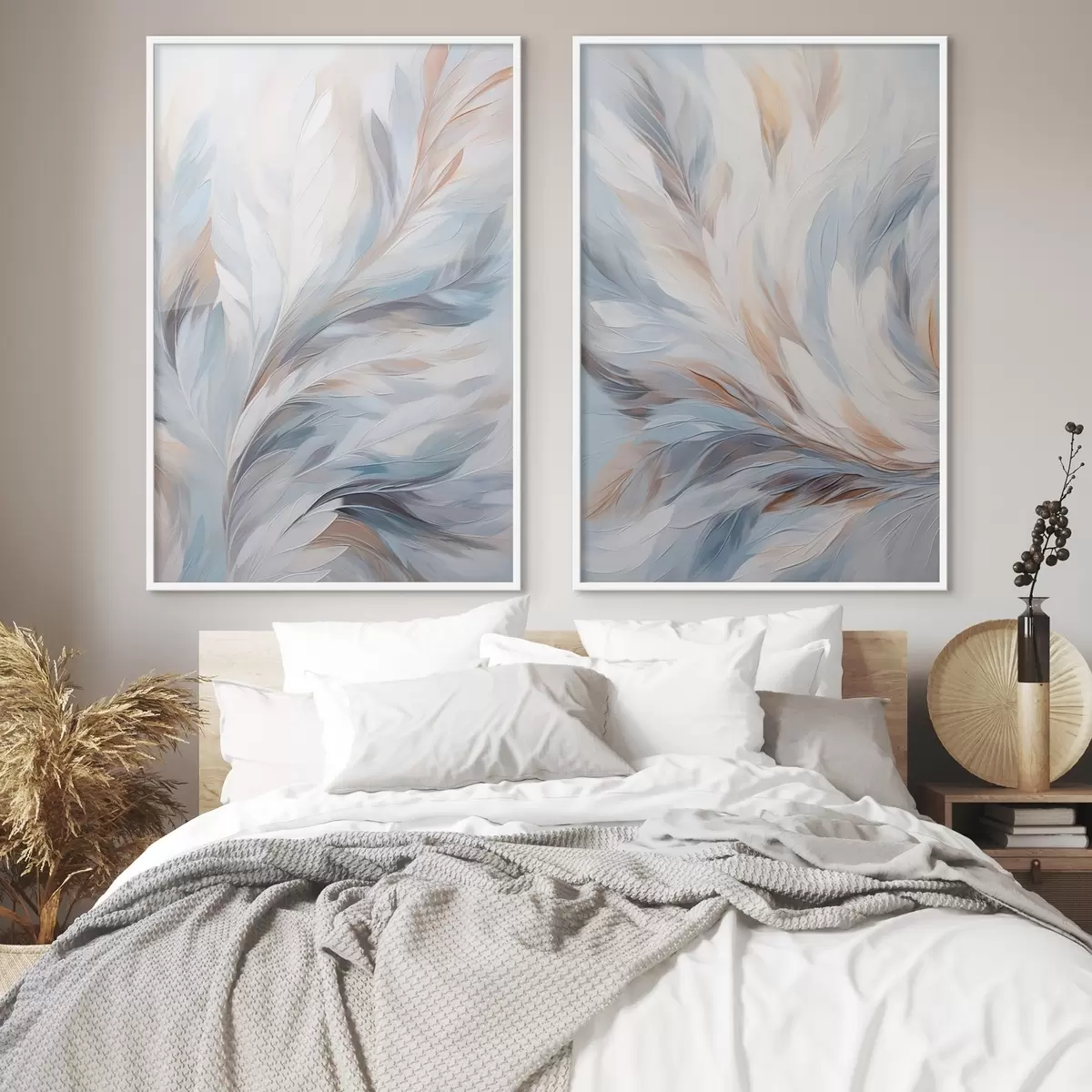 Poster Abstrakte Malerei von Federn in Weiß-, Blau- und Brauntönen, mit einer weichen, fließenden Textur und einem hellen Hintergrund d01234