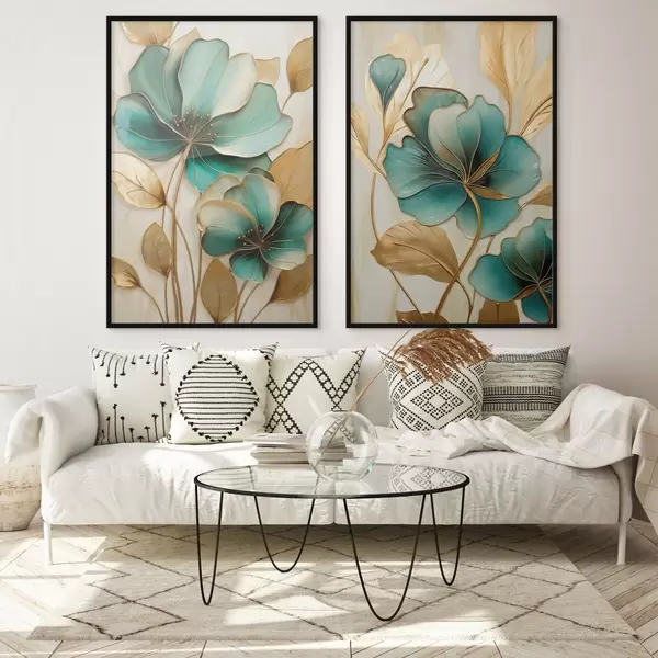 Poster Große blaugrüne und gelbe Blumen mit Konturen, umgeben von gelben Blättern vor abstraktem Hintergrund Nr d01235
